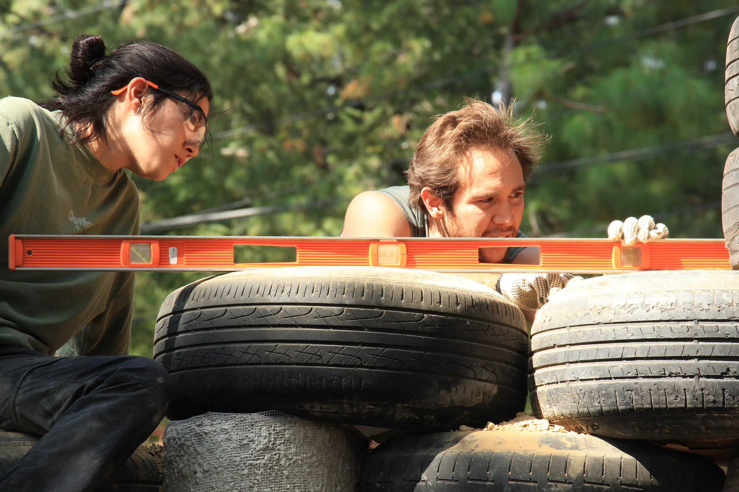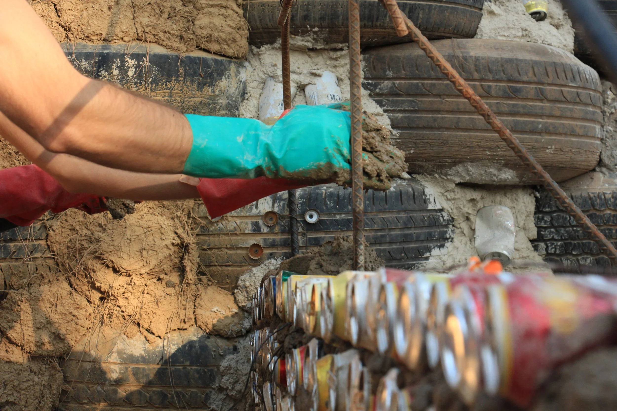 Sus muros macizos, hechos con neumáticos compactados y otros materiales reutilizados, son resistentes a huracanes y terremotos.